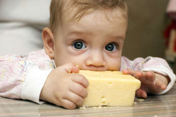 Once your baby is able to handle textures, at around nine to 12 months of age, you can give them cheese in small cubes or grated pieces. Again, make sure the cheese is pasteurized.